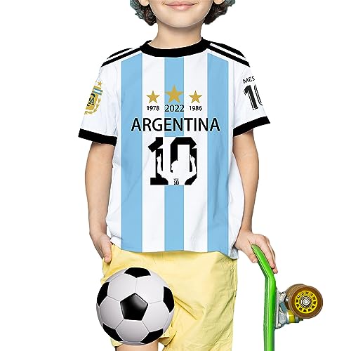 Argentina 3 Star Jersey Football Soccer – Light Blue Number 10 Champions T-Shirt Ages 5-7 Cool Printed Crew Neck – Short Sleeve Unisex Sports Tees Flag Light Blue White
