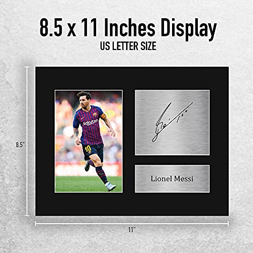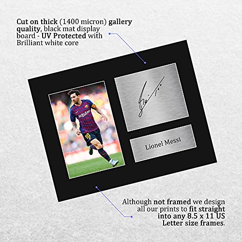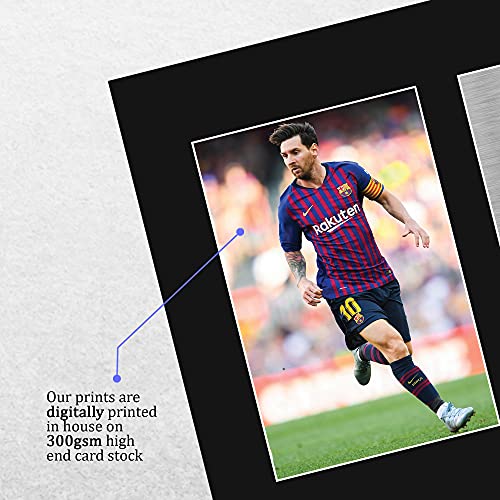 Professionally made in our studio, this US Letter Size (8.5×11 Inch) unframed Lionel Messi display makes for an ideal gift idea. This laser printed quality photograph is mounted in a precision cut three windowed acid-free matt black display board. To the left of the display there is the main image. To the right of the display there are two metallic effect plaque areas for printed copies of the name and autograph signature. These mounts also come with a ridgid backing board making them very sturdy and can be displayed or hung as they are. If you wish to frame them they will fit in any US Letter Size Frame. Alternatively we offer a framed version too. Lightweight, but of the highest quality, these make the ideal Christmas/Birthday gift for fans of all ages, and best of all, they definitely won’t break the bank!