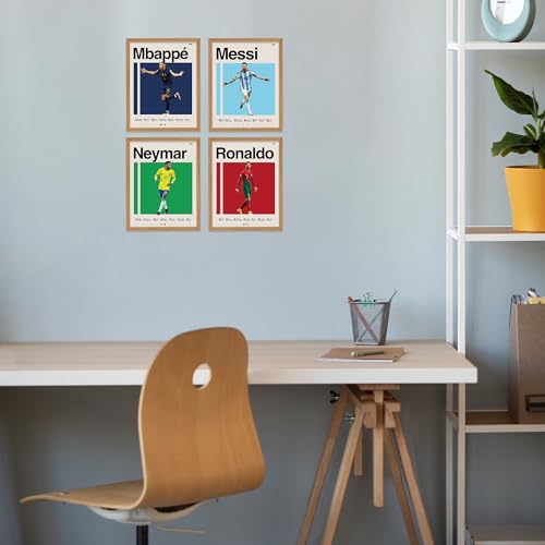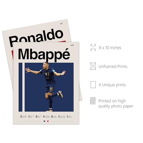 World-Class Football Legends: Elevate your space with a set of four iconic posters featuring Messi, Ronaldo, Mbappe, and Neymar – the most celebrated names in the world of football. The 8×10 inch dimensions make these posters ideal for any wall or favorite spot in your home