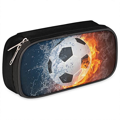 3D Football Leather Pencil Case Pen Holder Sports Large Capacity Black Stationery Storage Pencil Bag with Zipper for Boys Girls Soccer Ball in Ice Fire Pencil Pouch Box for School College Office