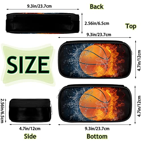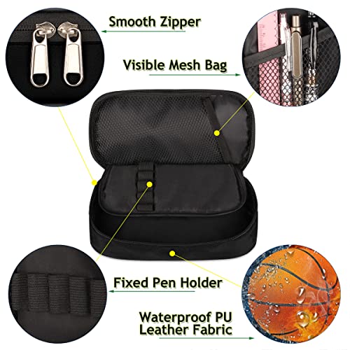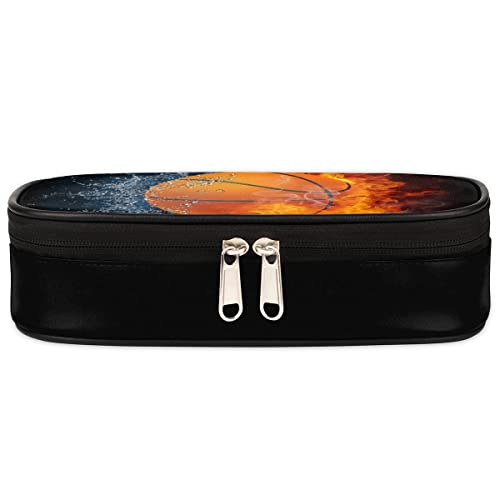 Fire Basketball Leather Pencil Case Pen Holder Sports-Themed Black Large Stationery Organizer Pencil Bag with Zipper for Boys Girls 3D Basketball Pencil Pouch Storage Box for School College Office