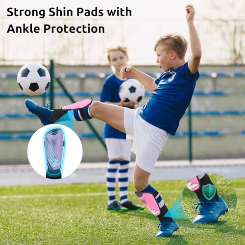 Ankle Protection Shin Guards: The boys and girls shin pads feature ankle protection made of durable polyester fiber to provide full support and coverage. With our ankle padding, you can play with confidence knowing you are protected from potential ankle injuries. The cushioning support provides maximum protection, so you can focus on playing your best game.
