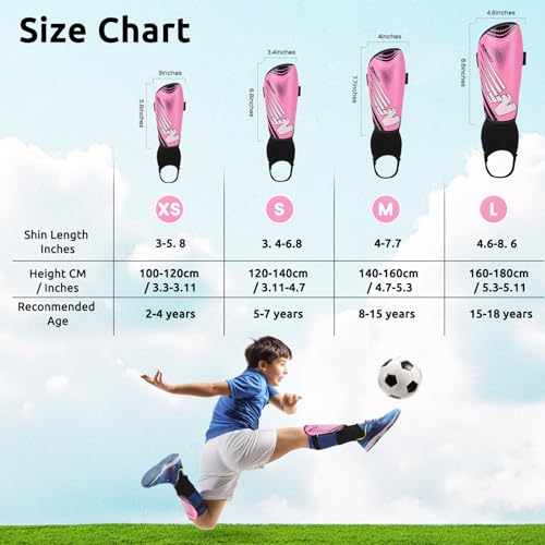 Multiple Sizes: There are four sizes soccer shin guards and suitable for 2-18 years old boys and girls. Following only for reference, Size XS, for 2-4 years old less than 3’11” tall ; Size S, for 5-7 years old in 3’11”- 4’7″ tall; Size M, for 8-15 years old in 4’7″- 5’3″ tall; Size L, for 15-18 years old in 5’3″- 5’11” tall. Please check our size chart for more details to select the best fit size.